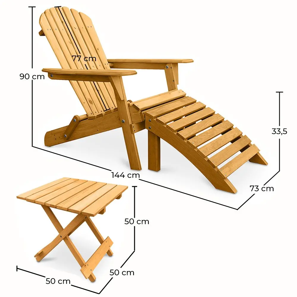 This durable set of garden chair, table, and footrest is also suitable for a hotel or restaurant, and being made of hemlock wood, will stand up to all weather conditions. With its timeless, classic design, it is not only comfortable but attractive too. The wooden table is just the right size to place next to the chair.
