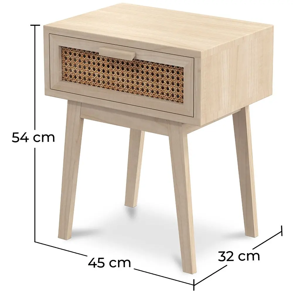 This design bedside table is ideal for bedrooms at home or in hotels. Keep your personal belongings close at hand, such as the TV remote, eBook or your mobile phone thanks to the storage space offered by the drawer with a mesh front, which opens and closes smoothly thanks to the premium quality hinges . The rattan with cannage design and the natural color of the wood of this nightstand combine perfectly with any style of decoration. The cannage design is typical of the boho chic style and will give your bedroom a unique touch.