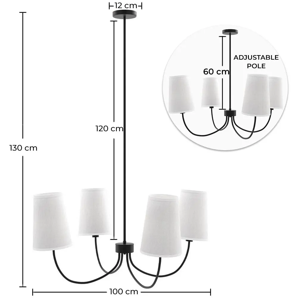 Transform your dining room into a luxurious space with our chandelier-style pendant lamp. With a contemporary design, this lamp combines a sturdy black metal frame with four white fabric shades, offering warm and cozy lighting that invites relaxation. Ideal for hotels and restaurants seeking a distinctive touch, this pendant lamp is perfect for creating memorable atmospheres. Its elegant and functional design makes it an excellent choice for illuminating and decorating your dining table, bringing style and sophistication to any setting.