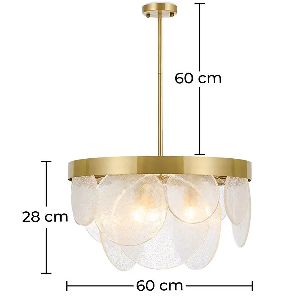 With a height of 28cm and a diameter of 60cm, this chandelier will stand out in every room. The hanging metal construction looks shiny while the glass part appears like circular slices. This creative design is one you are not likely to find in other pendant lamps. Make your room stand out!