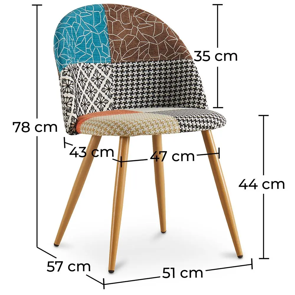 The comfort of the seating area is crucial to making a memorable dining chair, be it in a hotel, restaurant, or at home. This kitchen chair is made of a metal frame with wooden transfer painting and upholstered with patchwork fabric.