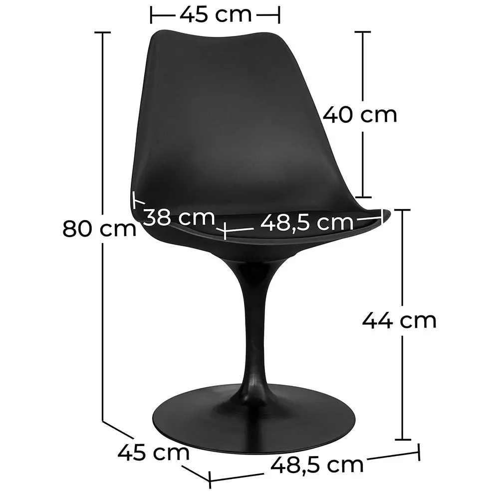 We present you the mythical black Tulipa chair in a cheaper version but with the same high quality as always. This swivel chair is made with a PP seat and a solid steel leg painted in black. The cushion is upholstered in imitation leather and its soft foam provides great comfort. The durable black Tulipa chair will look ideal in any style of living room.