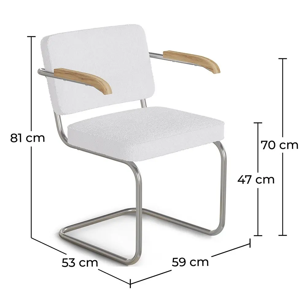 Whitewash boucle upholstery with a metal leg is a great combination for a dining chair. This comfortable and stable chair is an on trend piece. A perfect silhouette for a dining room.