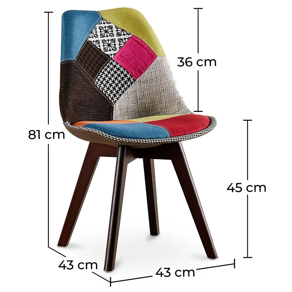 We love this Brielle design multicolor patchwork dining chair for its retro scandinavian style. Its legs made of dark wood give it a simple and classy look. The fabric upholstery ensures comfort and the Fiona patchwork model brings freshness. This chair model is part of the new premium edition. Enjoy its comfort. Fits your dining room perfectly as well as hotels and restaurants.