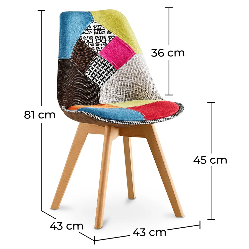 You will love this Brielle design multicolor patchwork dining chair for its retro scandinavian style. Its legs made of wood give it a simple and classy look. The fabric upholstery ensures comfort and the Fiona patchwork model brings bright colors. This chair model is part of the new premium edition. Enjoy its comfort. Best fit for a home dining room as well as for hotels and restaurants.