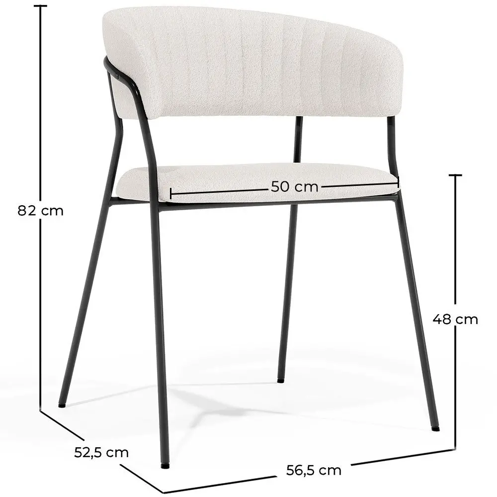The dining chair upholstered in bouclé fabric with a black metal frame is an elegant and versatile piece that perfectly combines style and comfort. Its bouclé fabric upholstery gives it a soft and cozy texture, providing a sense of luxury and comfort to those who sit on it. This fabric is also durable and resistant to wear, making it an ideal choice for high-traffic spaces such as hotels, restaurants, and also for the home. The metal used in its frame is sturdy and robust, ensuring a solid and stable base for the chair. Additionally, the black color is elegant and versatile, allowing it to seamlessly blend into different decorating styles.