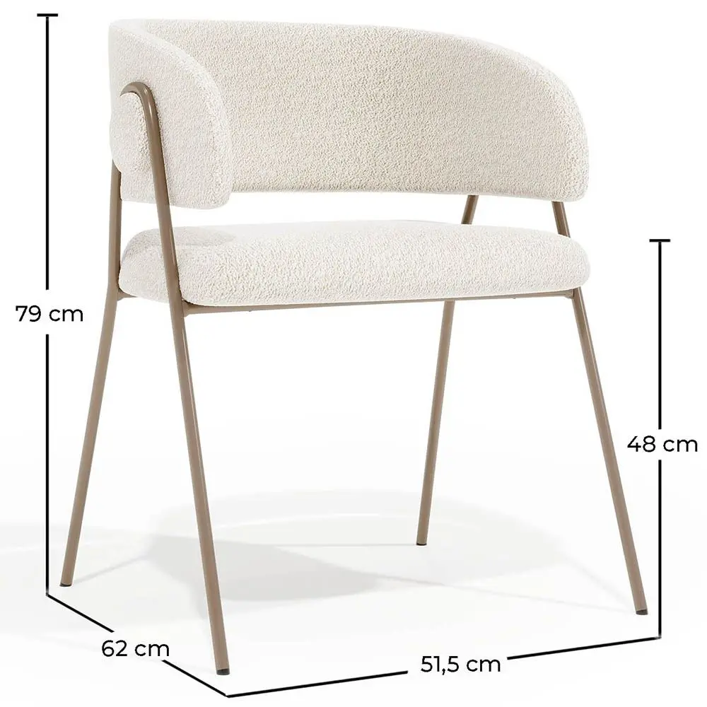 The combination of bouclé upholstery and champagne-colored metal legs creates a balanced and harmonious aesthetic. Our Manar chair adapts to a variety of decorative styles, from contemporary to classic, and becomes the focal point of any dining room. The metal legs in a soft and sophisticated champagne tone bring a modern and refined look. Metal is known for its strength and durability, ensuring a sturdy and resilient chair that can withstand daily use without losing its charm. The bouclé upholstery of the chair adds a touch of texture and softness, creating a unique visual and tactile experience. The delicate and intertwined loops of the bouclé fabric provide a luxurious and pleasant sensation when seated, turning every meal into a moment of comfort and relaxation.