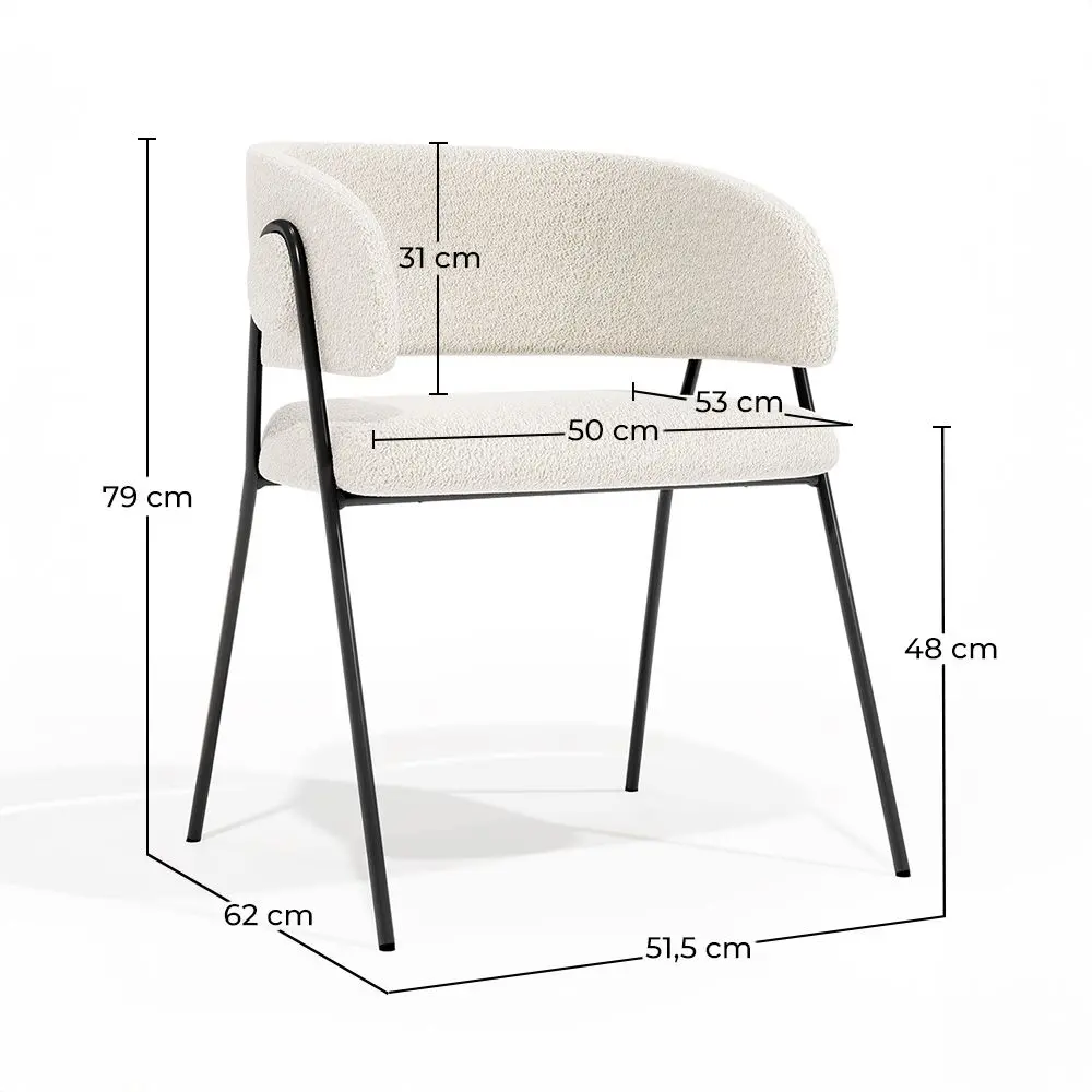 The combination of bouclé upholstery and black metal legs creates a balanced and harmonious aesthetic. Our Manar chair adapts to a variety of decorative styles, from contemporary to classic, and becomes the focal point of any dining room. The metal legs in a soft and sophisticated champagne tone bring a modern and refined look. Metal is known for its strength and durability, ensuring a sturdy and resistant chair that can withstand daily use without losing its charm. The bouclé upholstery adds a touch of texture and softness, creating a unique visual and tactile experience. The delicate and intertwined loops of the bouclé fabric provide a luxurious and pleasant feeling when sitting, turning every meal into a moment of comfort and relaxation.
