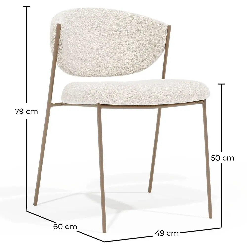 The dining chair upholstered in bouclé fabric with a champagne-colored metal structure is an elegant and versatile piece that perfectly combines style and functionality. The bouclé fabric upholstery gives it a textured and sophisticated appearance, adding a touch of warmth and comfort. Its metal construction ensures exceptional durability, making it an ideal choice for hotels, restaurants, and residential use. The enveloping backrest of the chair provides ergonomic and comfortable support, making this design chair a perfect choice for hotels and restaurants