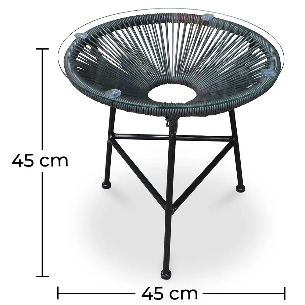 The Acapulco garden table has a black steel structure with synthetic wicker and a round glass top. It is an elegant and stylish outdoor table.