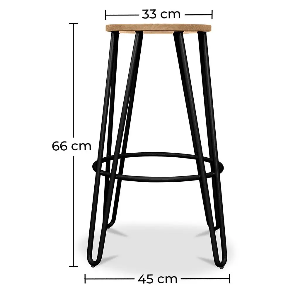 This industrial hairpin stool is the perfect seat to a kitchen, a café, or any commercial setting. Made with a solid light wood seat and metal hairpin legs, this industrial style bar stool is very durable and sturdy.