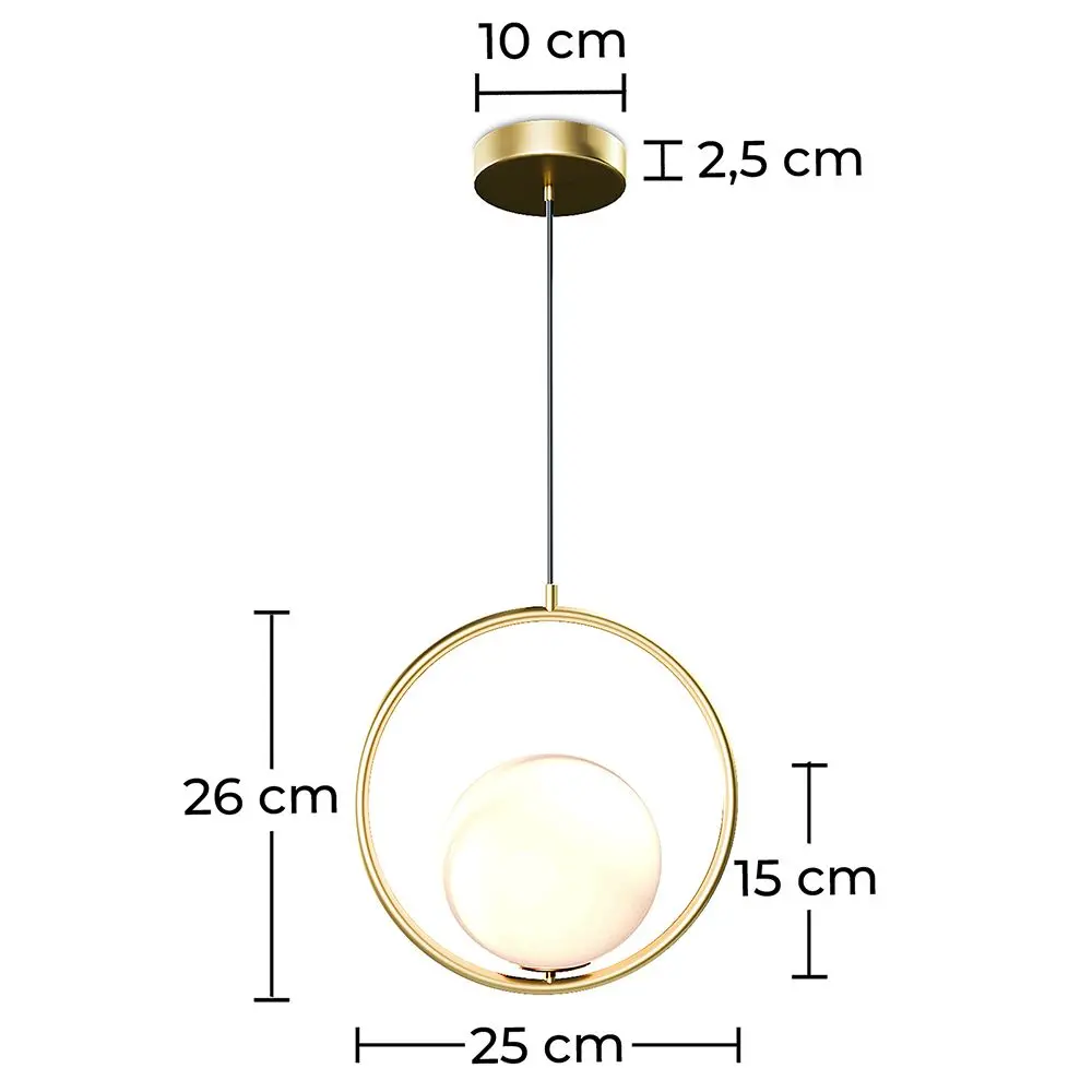 Gele is an eye-catching pendant light with a sophisticated silhouette. It has a white glass shade inside a streamlined metal ring. A statement piece to grace the bedroom, dining room, entryway, hallway, or kitchen island.