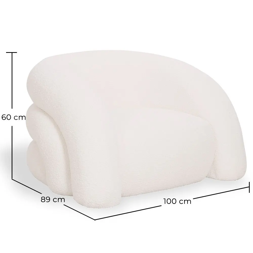 Discover the elegance and comfort of this modern armchair in cream white bouclé fabric, ideal to add a sophisticated touch to your living room, bedroom, or reading corner. Its curved and enveloping design offers a unique relaxation experience, while the bouclé upholstery provides texture, softness, and contemporary style.