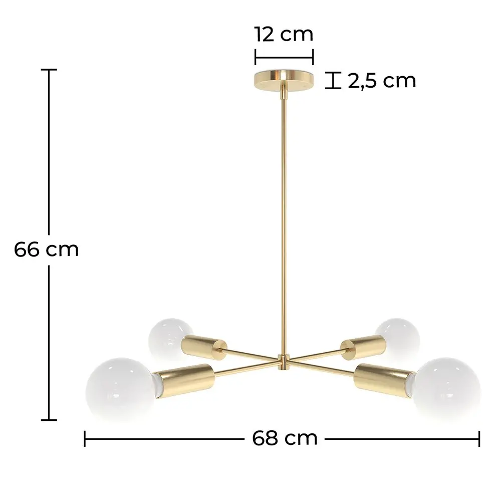 This is a four arm chandelier made from brass. The four bulbs are perfect to illuminate a living room or a dining room. It creates a unique atmosphere in your living space, and gives an elegant and modern look.