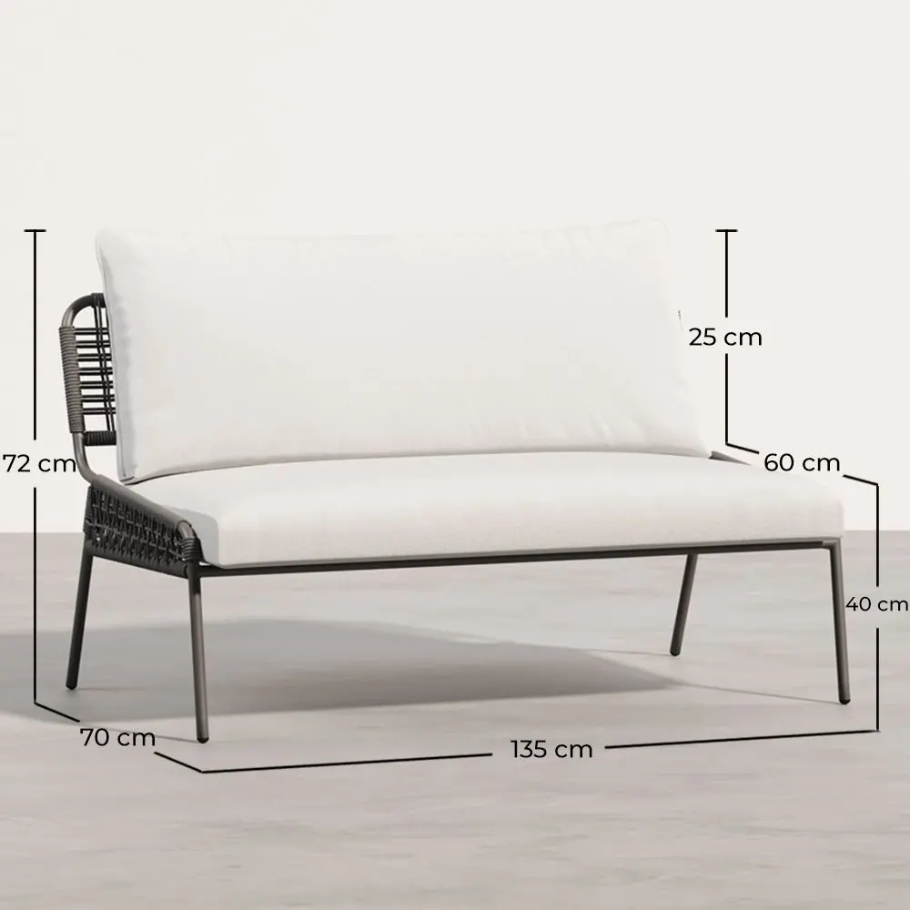 Measuring 135 cm in length, this outdoor sofa stands out with its sturdy metal frame and removable cushions upholstered in polyester, designed to withstand outdoor conditions. Perfect for relaxation areas in gardens, patios, and terraces, it offers the perfect blend of comfort and durability. The cushions are removable and washable, making maintenance easy and ensuring a pristine appearance over time. Add a touch of sophistication and functionality to your outdoor space with this elegant and practical sofa.