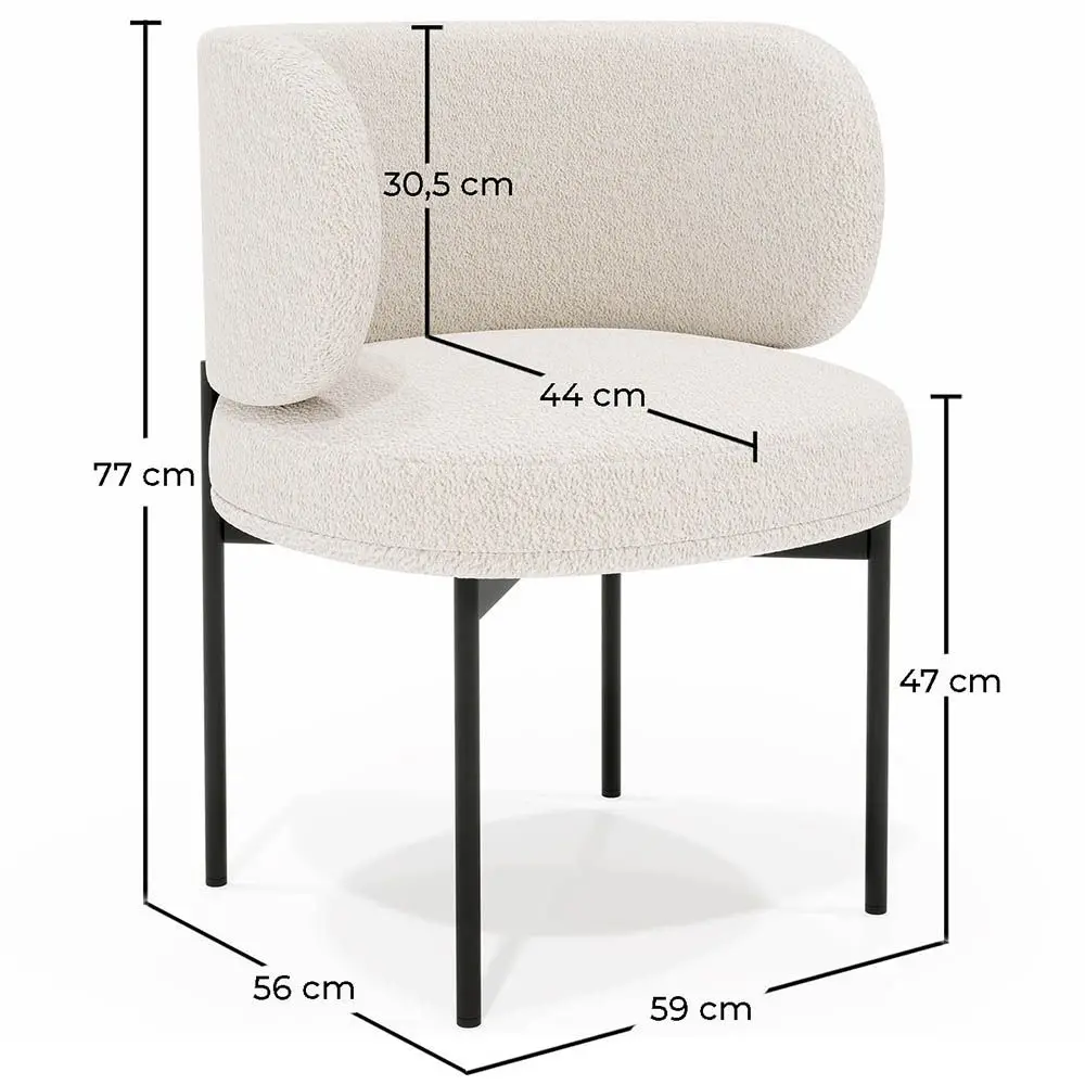 The Calibri dining chair is perfect for hotels, restaurants, and commercial spaces due to its combination of style and durability. Its sleek and modern design fits well in various environments, while the ergonomic backrest and round seat provide comfort for guests during their stay. Additionally, the sturdy black metal frame and bouclé fabric upholstery ensure that the chair can withstand heavy use without compromising its appearance and quality.