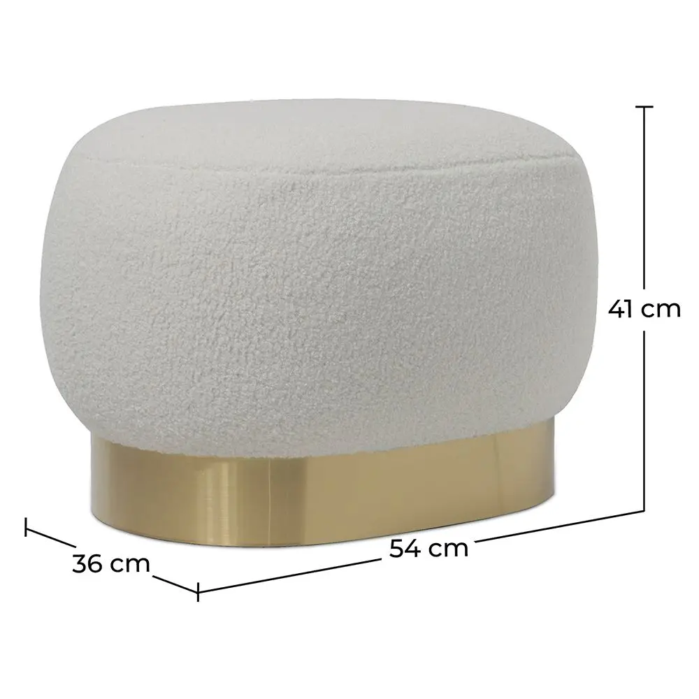 This beautiful pouffe upholstered in white boucle fabric with a gold metal base is the perfect touch of elegance and sophistication for any space. Its simple design, combinable with any other style of decoration, makes it a great option to use as an auxiliary seat or for vanity table.