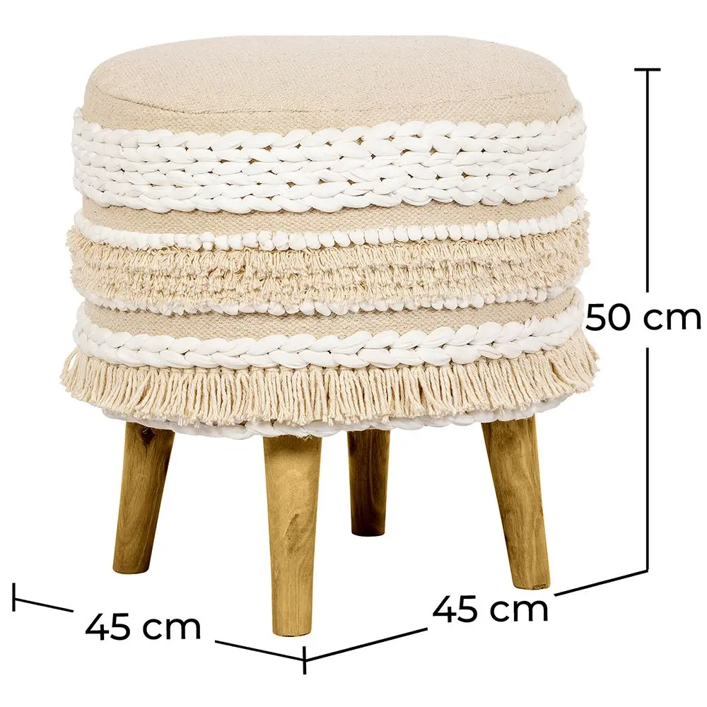 Isabella is a light and small decorative stool. It stands on four wooden legs and is upholstered in a boho style mixture of cotton and recycled yarn. It can be used as a footstool or as extra seating. Advantages? Easy to move around, handmade, decorative and functional.
