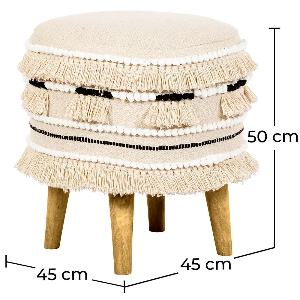 Jessie is a light and small decorative stool. It stands on four wooden legs and is upholstered in a boho style mixture of cotton. It can be used as a footstool or as extra seating. Advantages? Easy to move around, handmade, decorative and functional.