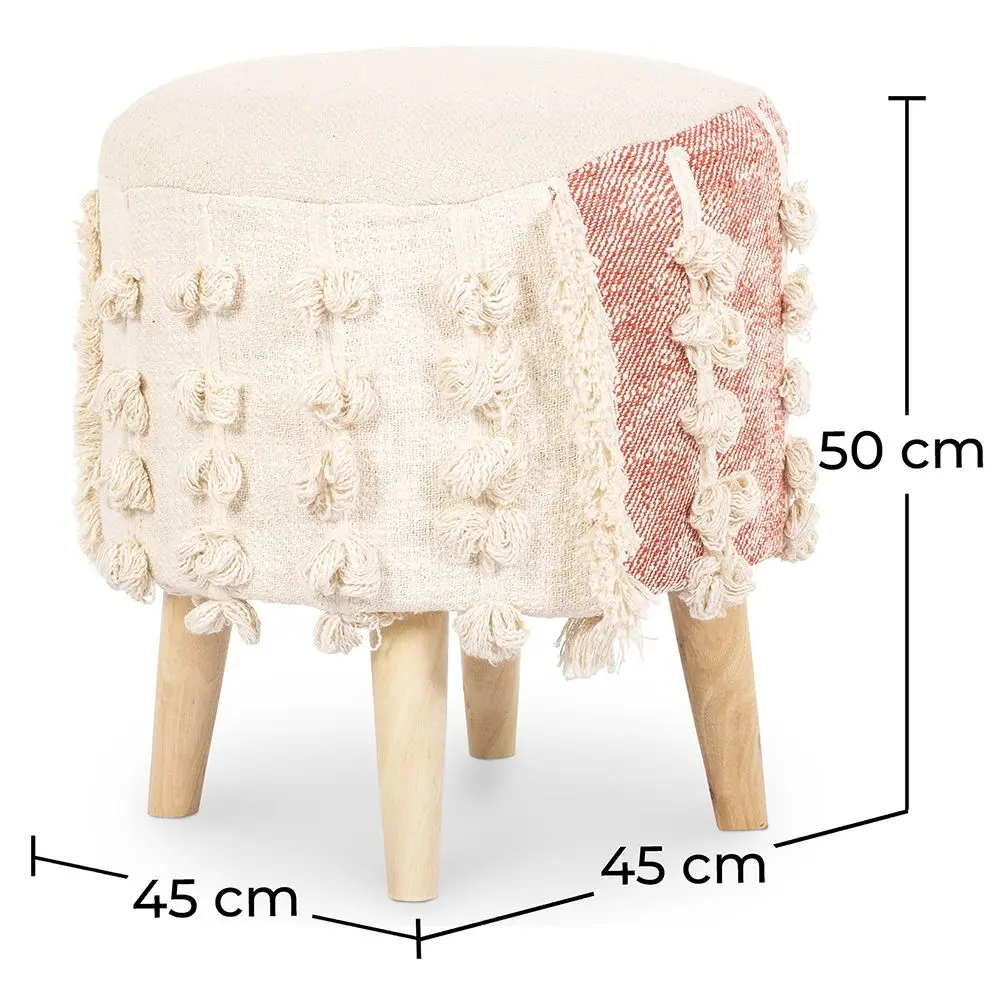 Vanessa is a light and small decorative stool. It stands on four wooden legs and is upholstered in a boho style mixture of cotton. It can be used as a footstool or as extra seating. Advantages? Easy to move around, handmade, decorative and functional.