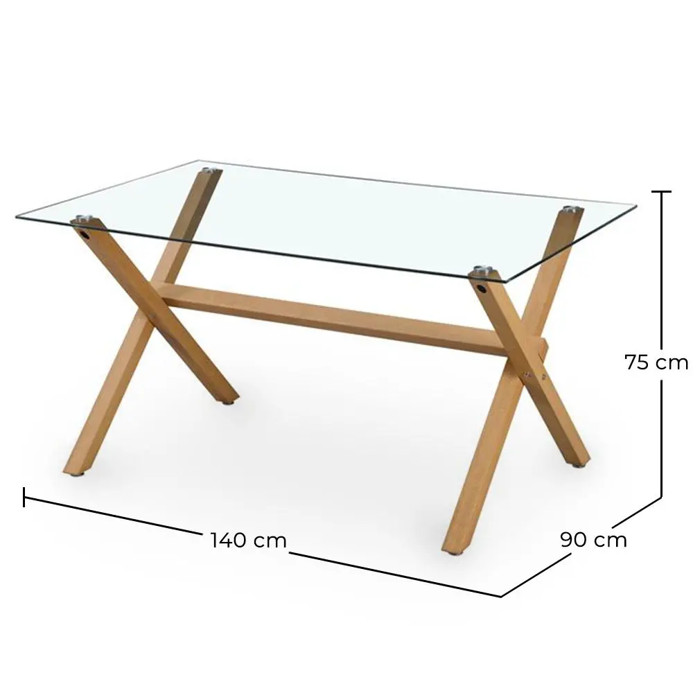Refresh your dining room with this rectangular tempered glass dining table, perfectly combining design and functionality. Measuring 140 cm wide, 90 cm deep, and 75 cm high, it is ideal for 6 diners. Its metal legs with a wood-effect finish provide stability and a warm touch, inspired by Scandinavian style. Its elegant and modern design makes it a versatile choice for minimalist spaces, enhancing your dining room’s aesthetic with simplicity and style.