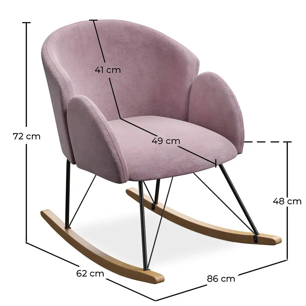 We love this rocking armchair. It has natural wood legs and is upholstered in velvet. It is stylish, elegant and cosy. The back is rounded and armrests frame the seat. This is a rocking chair everyone will enjoy. We can imagine it in the corner of a room, near a window or a fireplace.