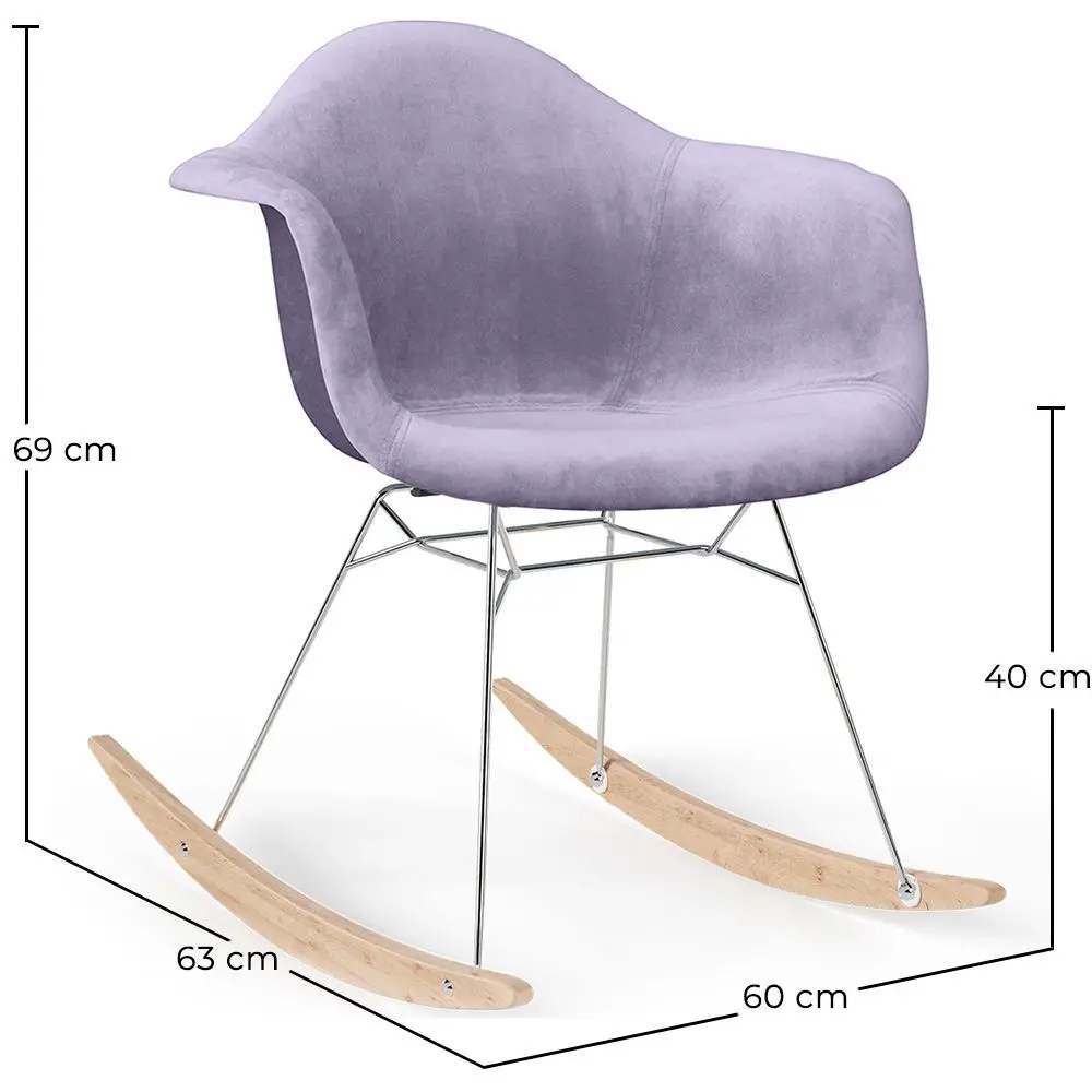 Add a touch of design and comfort to any room with this modern rocking chair upholstered in velvety fabric. Its chrome-plated steel frame provides stability and style, while its solid natural wood sleds provide a gentle rocking motion, ideal for relaxing moments. The ergonomic, enveloping seat is covered in soft velvet upholstery, perfect for living rooms, bedrooms, or reading nooks. A versatile and elegant piece that combines Scandinavian design, functionality, and warmth.