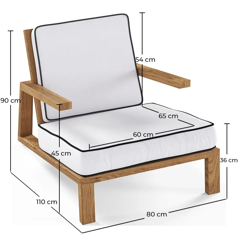 This outdoor armchair made of teak wood is an excellent addition to any outdoor space. Teak, renowned for its durability and weather resistance, ensures a long lifespan and impeccable appearance. The removable cushions, upholstered in polyester, offer superior comfort and are easily washable, remaining fresh and clean at all times. Perfect for gardens, terraces, or balconies, this armchair combines the natural beauty of wood with the comfort of its cushions, providing a luxurious and practical seating option for enjoying the outdoors.