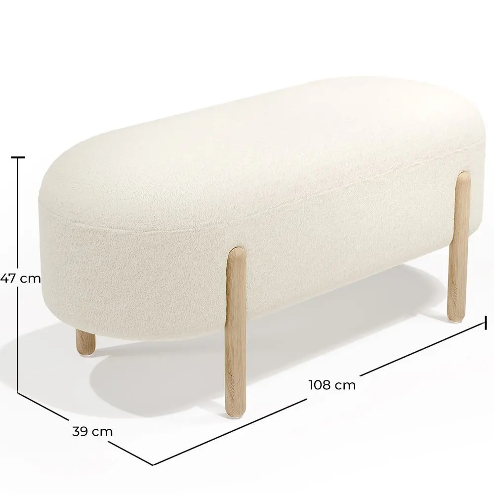 Dive into contemporary luxury with our Round bench upholstered in exquisite bouclé fabric, designed with curved lines that reflect the essence of Scandinavian style. The natural-toned wooden legs add a touch of warmth and connect the design with nature. At a length of 108 cm, this bench with sheepskin fabric is the perfect choice to optimize space without sacrificing comfort. Its versatility makes it a standout element for both homes and restaurants and hotels, adding a touch of elegance to any setting. The combination of high-quality materials and ergonomic design makes this bench the ideal option for those seeking to merge Scandinavian style with modern functionality.