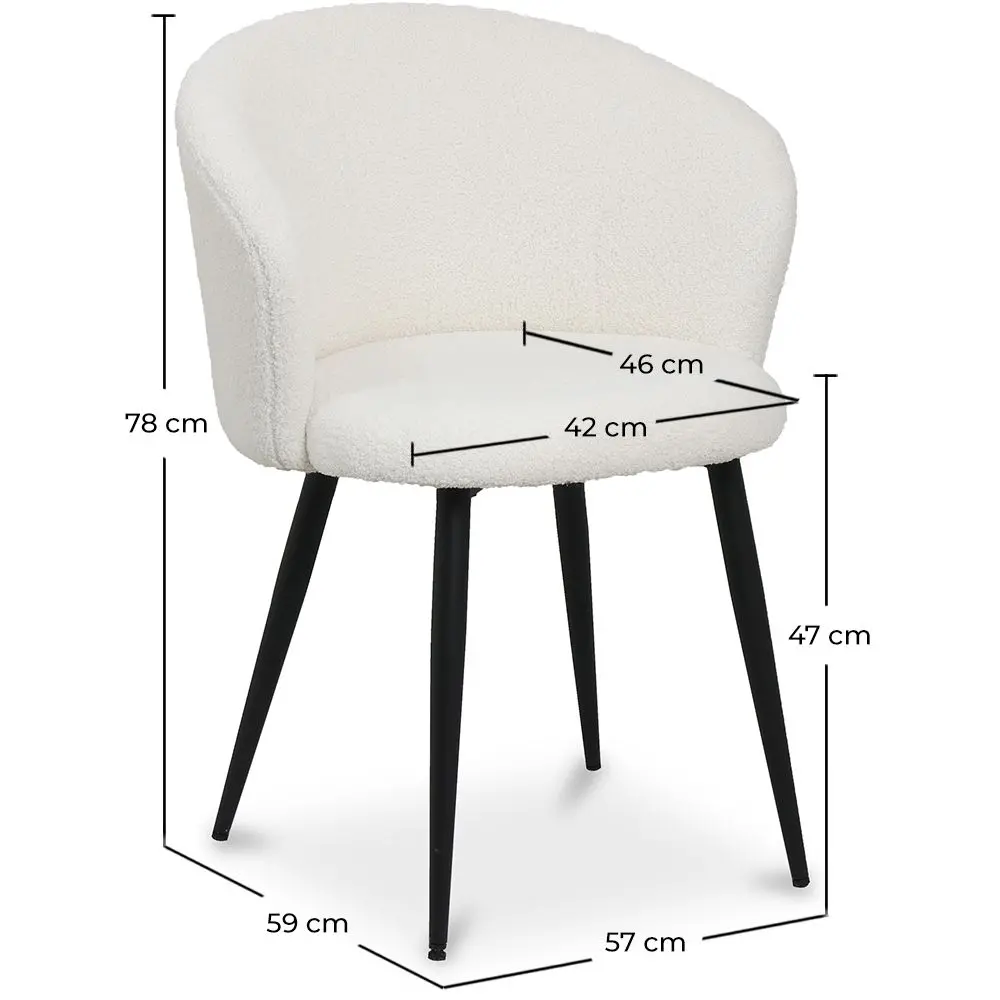 Discover the perfect balance between style and comfort with our bouclé upholstered dining chair. The exquisite soft-touch upholstery invites relaxation and enjoyment of long evenings at the table, while the curved backrest provides optimal support for the back. With black metal legs that bring a touch of elegance and stability, this chair is a versatile choice that adapts to any setting. Whether in hotels, restaurants, or in your home dining room, this chair adds a touch of sophistication and comfort to any space.