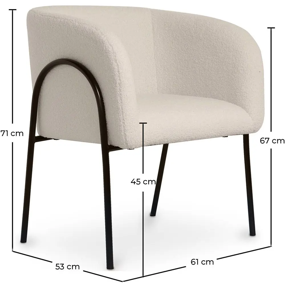 The Skye dining chair is a chair upholstered in white boucle, with armrests and a tubular structure in black metal. The design of this stylish chair is enveloping and very comfortable, perfect for hotels and restaurants looking for a touch of luxury in their decoration. The weave fabric of its upholstery is very resistant and will remain in perfect condition for many years.