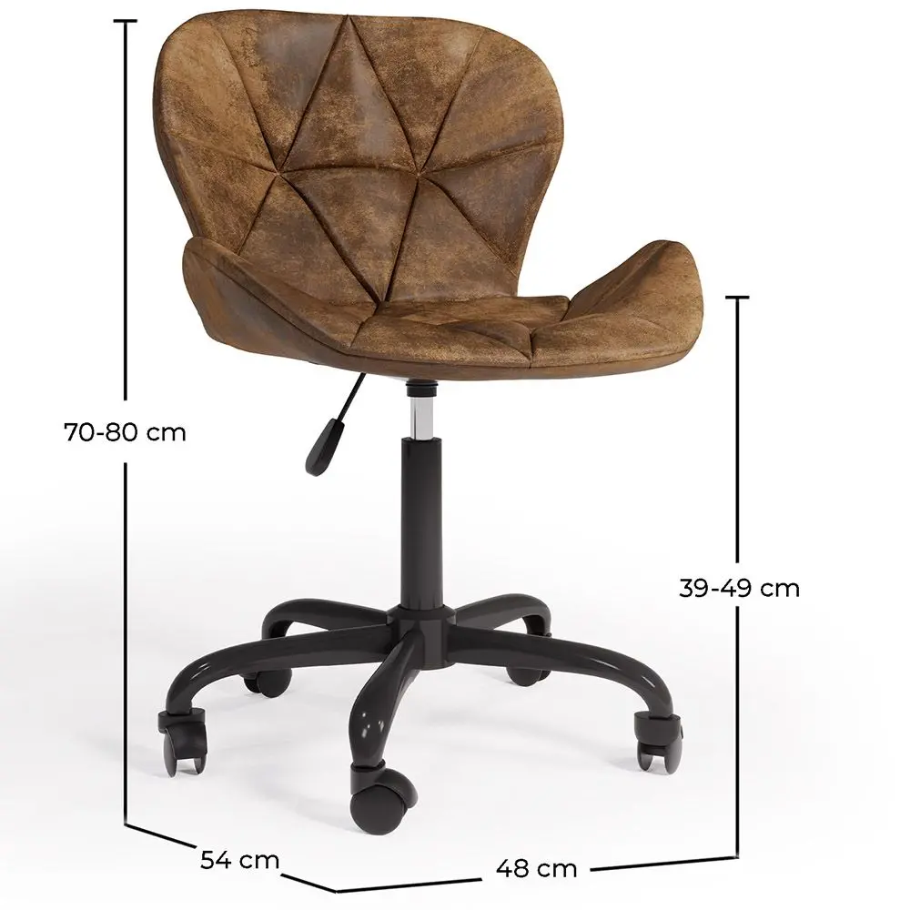 Immerse yourself in comfort and elegance with this vintage-designed office chair. Its vegan leather upholstery is not only an ethical choice but also adds a touch of luxury to your workspace. The smooth wheels provide effortless mobility, allowing you to move easily between tasks. The adjustable height, combined with the ergonomic backrest, gives you total control over your working position, ensuring a comfortable and healthy posture. The black metal leg structure is not only robust and durable but also adds a touch of modernity to the overall aesthetic of the chair. Experience the perfect fusion of functionality and style in every work moment with this exceptional office chair.
