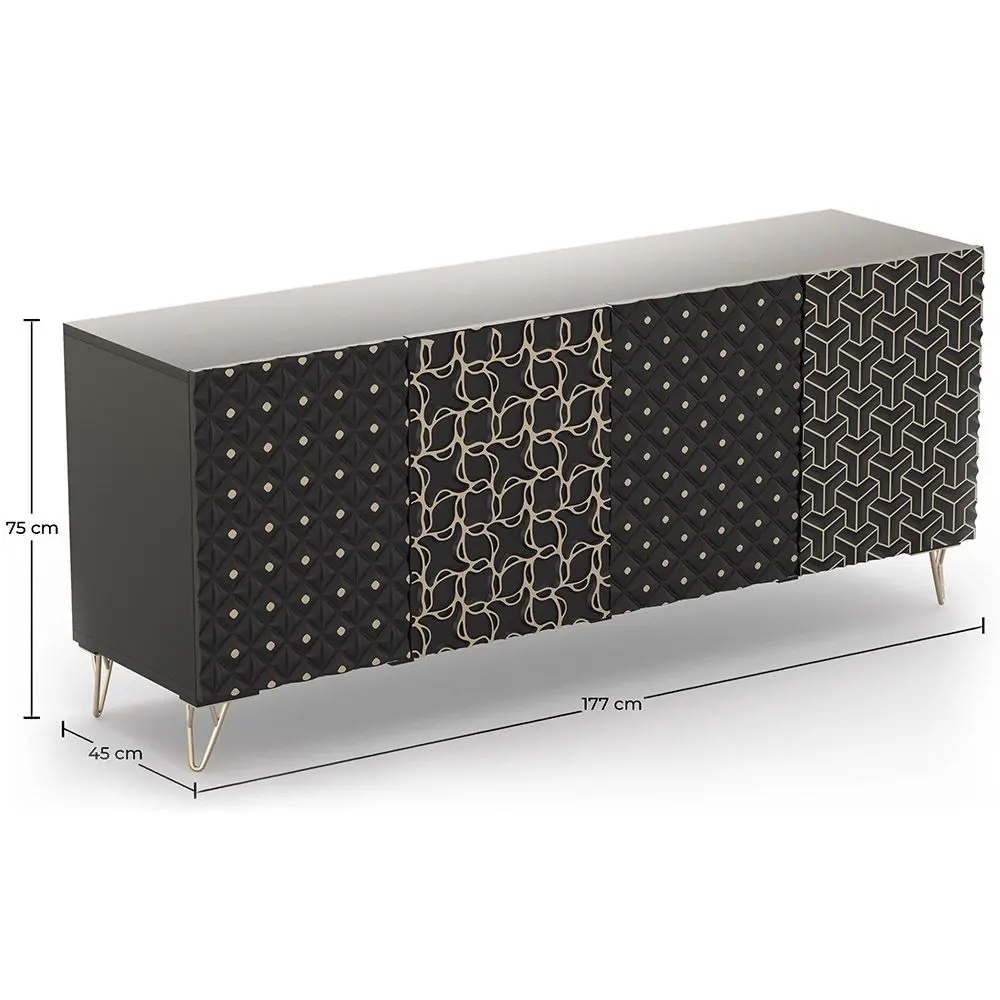 Prana is a wide sideboard that offers plenty of storage for all your things. The frame is made of mango wood with black finishing. Each door has a different decorative pattern. An elegant and functional piece to place in your living room, entryway.