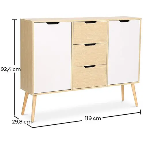 This magnificent Nordic sideboard is made of high quality wood and consists of 3 large drawers and two doors at the sides. This wooden sideboard not only stands out for its great storage capacity but also for its beautiful design that combines white with natural wood.