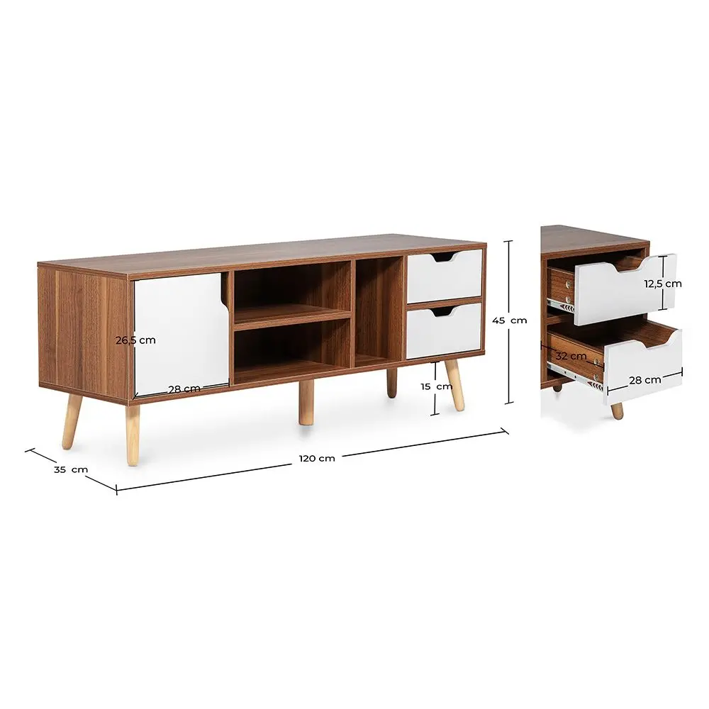 We love this TV unit. If you are looking to add a vintage touch to your living room and are in need of extra storage space, this piece of furniture is the right choice for you. It stands on pine wood legs, and the rest of the structure is made of particle board. It has one door, two drawers, and two shelves. A great colour combination to add style to your interior.