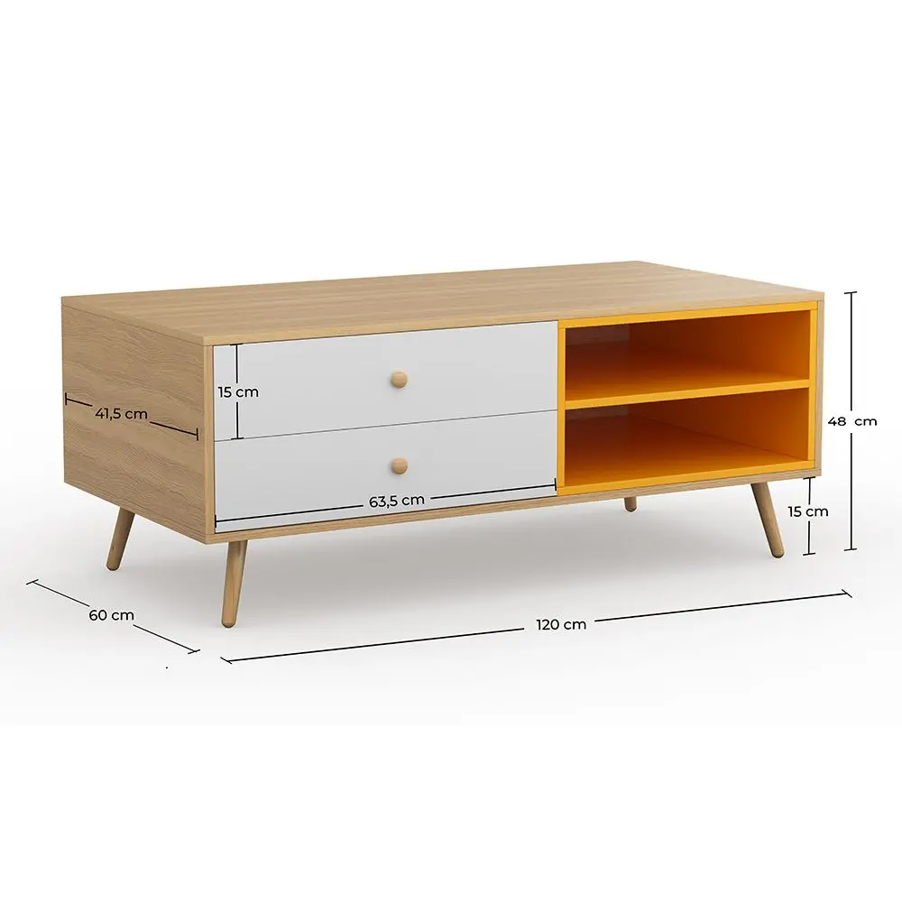 We love this vintage scandinavian style TV unit sideboard. It is a wooden sideboard, with slender legs made of pine wood and a structure made of particle board. It is colourful, has a combination of white, grey and yellow drawers and shelves, and offers lots of storage space. A stylish and playful piece of furniture to add to your living space!